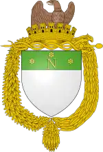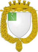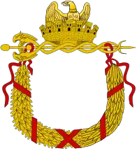 Sur le blason : Chef de sinople chargé de la lettre capitale N accompagnée de trois roses de six feuilles mal ordonnées, tous d'or, qui est des bonnes villes du Royaume. Ornements extérieurs : Couronne murale à sept créneaux d'or, surmonté de l'aigle naissante au naturel, tenant entre les serres un caducée d'or posé en fasce ; le tout accompagné de deux guirlandes entrelacées d'olivier et de chêne du même, séparées entre les deux flancs et réunies et pendantes de la pointe. Les bonnes villes (buone città) étaient : Milan, Venise, Bologne, Brescia, Vérone, Mantoue[15]. |