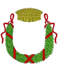 Sur le blason : franc-quartier ou franc-canton d'azur, à un épi de blé d'or, posé en pal. Ornements extérieurs : Toque de velours noir, retroussée de contre-hermine, avec porte-aigrette or et argent, surmonté de cinq plumes d'argent. |