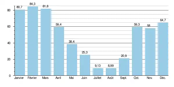 L'Hérault présente des fluctuations saisonnières de débit assez importantes, avec des crues d'hiver et de printemps portant le débit mensuel moyen entre 58,5 et 67,4 m3/s, d'octobre à mars inclus (maximum en janvier), et des basses eaux d'été de juin à septembre, avec une baisse du débit moyen mensuel jusqu'au niveau de 7,5 m3/s au mois d'août.