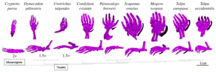 Le squelette adulte des taupes (de la famille des Talpidés) présente de nombreuses spécialisations liées à leur mode de vie souterrain, dont des mains élargies par rapport aux pieds. L'hétérochronie qui survient dans les mécanismes de développement devrait être en mesure d’expliquer l'évolution morphologique des éléments du squelette (donc leur forme, apparence). Une étude a été menée afin de comprendre la cause qui pourrait justifier une différence dans le développement du membre chondral, c’est-à-dire le cartilage, ainsi que des variations de taille chez les autopodes, les membres antérieurs et postérieurs adultes[12]. Est-ce qu’une hétérochronie transcriptionnelle peut conduire à un motif morphologique?