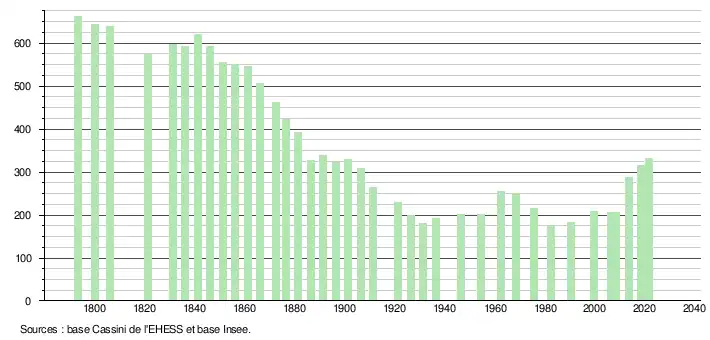 L'évolution du nombre d'habitants est connue à travers les recensements de la population effectués dans la commune depuis 1793. Pour les communes de moins de 10 000 habitants, une enquête de recensement portant sur toute la population est réalisée tous les cinq ans, les populations légales des années intermédiaires étant quant à elles estimées par interpolation ou extrapolation[27]. Pour la commune, le premier recensement exhaustif entrant dans le cadre du nouveau dispositif a été réalisé en 2008[28].