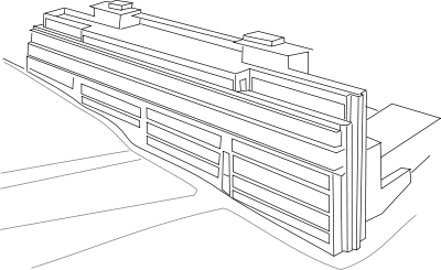 - Le bâtiment principal (A), surnommé « le paquebot » en raison de sa forme élancée sortie du flanc de la colline.