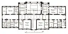 L'installation initiale en 1872 dans un système de baraquements corresponde à la conception de l'hygiène de l'époque. Les patients sont séparés en fonction de la nature des maladies et placés dans des groupes plus petits. En cas d'épidémie, cela permet d'éviter la propagation à d'autres patients. Les baraques sont constituées de simples colombages en bois, les constructions plus massives sont en maçonnerie avec des parements en briques, les parties structurantes sont créées en terre cuite. Ces méthodes de construction et la disposition des baraques en forme de fer à cheval régulier peuvent être classées, sur le plan architectural, dans la catégorie de l'éclectisme sobre[5]. Il ne reste plus aucune des baraques d'origine, car elles sont entièrement remplacées par des constructions en dur à partir de 1920.