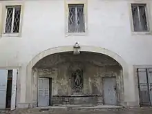 Au troisième niveau, un vaste cartouche sculpté encadré de lions rampant et délimité par des cuirs portait primitivement les armoiries des deux familles.