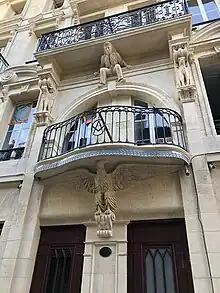 La façade la plus vaste est celle de la rue Saint-François, qui donne au nord. Sur cinq niveaux et seize travées, elle est percée de soixante-deux baies surmontées de frontons baroques. Le premier balcon de la travée centrale est porté par pierre sculptée représentant un aigle, ailes déployées. Sur son garde-corps en fonte figurent un compas et une équerre dans l'ovale d'un blason — symbole franc-maçon, emblème des architectes ou initiales stylisées d'Antoine Audubert ?[5] Le balcon qui le surplombe, élément le plus remarquable de l'immeuble, est soutenu par un homme statufié aux allures d'ouvrier, assis, jambes écartées, prenant appui de ses pieds sur la corniche inférieure, chemise ouverte, manches retroussées et pantalon flottant — et dominant de fait le rapace mythique, comme « délivré de sa monture mais asservi par l'architecture »[2]. Deux petits sphinx l'encadrent, aux extrémités du balcon.
