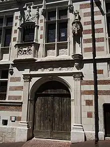 De la façade d'origine, seuls sont conservés l'encadrement et le décor des fenêtres du rez-de-chaussée ainsi que le portail monumental. Le mur et les fenêtres rappellent en tous points le style gothique du palais de Louis XII. On y retrouve les lits horizontaux de briques rouges et de tuffeau blanc mais aussi les culots sculptés de petits personnages grotesques (anges, enfants, homme sauvage, centaure, etc.). Ces héritages du Moyen Âge coexistent avec des éléments beaucoup plus modernes, comme le portail avec ses pilastres cannelés et ses chapiteaux ornés de dauphins et de volutes[4],[17].