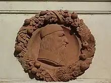 Les treize médaillons à l'antique en terre cuite qui ornent la balustrade de la galerie du premier étage et qui représentent presque tous des empereurs romains ont sans doute été rapportés directement d'Italie[4]. Exceptées quelques inventions, comme le portrait d'Aristote qui date des années 1880, ces médaillons sont donc bien contemporains de Florimond Robertet. Entourés d'une épaisse guirlande de fleurs et de fruits, ils étaient à l'origine peints en vert afin d'imiter la couleur du bronze et de mieux se distinguer de la façade[18].
