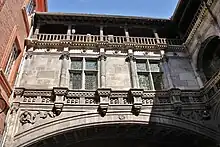 Le 1er étage est réuni par une galerie, ouverte du côté est, au revers de la rue, et fermée du côté nord, au-dessus du grand arc. Un garde-corps à balustres, dont la rampe est décorée de modillons, court le long des deux côtés. Les travées sont rythmées par des colonnes à demi-cannelées à chapiteaux corinthiens, qui soutiennent une fine corniche moulurée surmontée d'un entablement percé d'œils-de-bœuf et d'une large corniche à modillons.