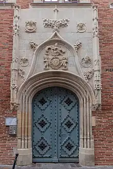 À l'intérieur de l'accolade, au-dessus de la porte, le médaillon central figure une tête d'Apollon, inscrit dans un soleil rayonnant. Il a remplacé, dans la deuxième moitié du XIXe siècle, le monogramme du Christ que les Jésuites avaient substitué au blason de la famille de Bernuy au XVIIe siècle. Le médaillon est entouré d'une couronne de fleurs tenue par deux putti porteurs de lances. Au-dessus, un troisième putto tient un phylactère où se lit la devise de Jean de Bernuy : Si Deus pro nobis (« Si Dieu est avec nous [, qui sera contre nous ?] » en latin). À l'extérieur de l'accolade sont disposés quatre médaillons ornés de bustes de personnages[23].