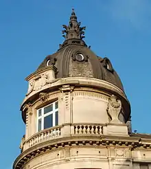 La tour d'angle est surmontée d'un coupole noire en ardoises, percée de lucarnes en forme d'œil-de-bœuf et surmontée d'un ornement en forme de gerbe végétale.