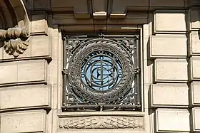 - les fenêtres du rez-de-chaussée sont surmontées de grilles en fer forgé portant le sigle de la CGER (ou plus exactement les trois lettres CER, Caisse d'Épargne et de Retraite), à l'instar des fenêtres latérales de la tour d'angle ;