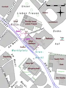 Pour édifier l'hôtel de ville gothique, la ville acheta et démolit deux maisons, la maison de la guilde des cordouaniers (tanneurs et cordonniers fins) et le domicile d'un maire banni. Il fut bâti comme une démonstration du pouvoir communal entre le palais archiépiscopal et la place du marché, qui avait été nivelée et pavée un siècle auparavant. Cet ancien hôtel de ville comprend une grande salle par étage sur trois niveaux : la salle supérieure pour les grandes réunions, la salle inférieure utilisée autrefois comme halle du marché (aujourd'hui comme salle d'exposition), et la cave municipale. Les salles étaient un petit peu plus longues et larges que la grande salle du palais archiépiscopal. Jusque 1608, l'hôtel de ville avait deux chemins de ronde, le premier sur la gouttière et le second sur l'arcade vers la place du marché. Sous l'arcade, on faisait des audiences de justice. Le conseil de la ville même, appelé la Wittheit, comprenait 36 personnes et siégeait dans une chambre annexe au niveau de la salle supérieure.