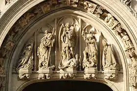 La base de la tour est percée d'un portail ogival surmonté d'un tympan figurant saint Michel entouré de saint Sébastien, saint Christophe, saint Georges et saint Géry (Gaugericus) qui, selon la légende, éleva une chapelle qui serait à l'origine de la ville de Bruxelles.