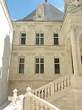 L’escalier d'honneur actuel est la troisième version. L'escalier primitif était en fer à cheval surmonté d'un baldaquin. L'ingénieur Claude Masse disait de cet escalier « C'est une espèce de fer à cheval mal construit et trop raide... »[MAS 3]. En 1612, on installe sous le baldaquin une statue du « bien bon ami des Rochelais »[44],[45], Henri IV. Cette statue, en terre cuite, peinte, représente Henri IV grandeur nature, en costume de guerre, revêtu d'une cuirasse, la tête nue, la main gauche sur la garde de son épée, et la droite appuyée sur un bâton de commandement[MAS 4],[MAS 3]. Outre la statue détruite lors de la Révolution, l'escalier s'écroula en 1812. En 1815, il est rebâti[46],[47] par Antoine Brossard, architecte de la commune. De style néoclassique, il s'harmonise mal avec le reste de la façade de style Renaissance et occupe un large espace de la cour[48]. Un nouvel escalier est conçu par J. Lisch plus en harmonie avec la façade de style Renaissance qui est réalisé au cours de la restauration du bâtiment à la fin du XIXe siècle[MFD 8]. Beaucoup plus petit et implanté devant le pavillon Nord, il permet un agrandissement de la façade principale avec l'ajout de deux nouvelles travées[PC 2]. L'escalier de l'architecte Juste Lisch comporte un baldaquin où est installée une statue du roi Henri IV en faïence polychrome de Théodore Deck[MFD 8].
