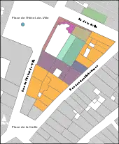 - l'enceinte côté place de l’Hôtel de Ville et la tour[25] ;