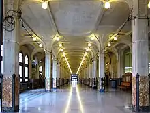 La galerie intérieure, divisée en trois nefs par deux rangées de 21 piliers à motifs floraux, s'étend sur 143 mètres de long. Les chapiteaux des piliers en béton ont été moulés dans des formes en aluminium tandis que leur base est habillée d'un décor de marbre et de fer forgé. Cette galerie forme une rue municipale qui ouvre sur quatre bâtiments transversaux abritant les bureaux des services sur trois niveaux. Trois halls aux plafonds ajourés les séparent. Les deux extrêmes sont entourés de guichets pour l'accueil du public tandis que le hall central accueille la salle du conseil. Deux escaliers d'honneur, partant de la galerie, desservent également le premier étage qui comprend notamment la salle des mariages, la salle des témoins, la salle Erro, la salle des commissions, le salon d'honneur et le bureau de Roger Salengro, dotés de leur mobilier d'époque. En hommage à Roger Salengro, poussé au suicide en 1936, son bureau est resté inoccupé depuis lors, les maires actuels occupant le bureau de l'adjoint. Partout dans la décoration, y compris sur le mobilier, se décline la fleur de lys du blason lillois, qu'on retrouve sur beaucoup de réalisations municipales de cette époque[5].