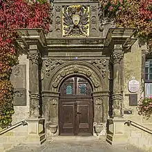 En 1615[1] /1616[2] et de 1898 à 1901, d'importantes rénovations ont eu lieu, qui lui donnent son aspect actuel. C'est ainsi que la façade, qui existe encore aujourd'hui, fut construite en 1615/1616. Au lieu des anciennes fenêtres gothiques en arc brisé, des fenêtres rectangulaires ont été insérées. L'entrée, qui se trouvait à l'origine sur le pignon ouest, a été déplacée du côté sud face au marché. Jusque-là, la pharmacie communale se trouvait ici. Cependant, l'entrée ouest a été initialement conservée et n'a été murée qu'en 1862[3]. Un escalier à sept marches mène au nouveau portail, construit en 1616. Le portail est encadré de colonnes et comporte des niches pour les sièges. Au-dessus du portail se trouve un aigle impérial noir, les armoiries de la ville de Quedlinburg et couronnée de l'allégorie de la déesse romaine Abondance. A gauche du portail, une plaque a été installée en 1922 pour commémorer la première mention documentaire de la ville en 922 par Heinrich I.