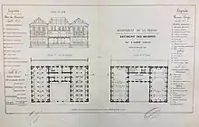 « Pierre-Auguste Labbé ». (1823 - 1881) déjà connu pour son travail sur la chapelle du Grand séminaire et l'hôtel des Sourdes-Muettes de la rue Castéja, est l'architecte départemental en cette période. Ses plans furent validés en 1860 par le conseil général des bâtiments civils et lors de la commission sommée par préfet du département, après une enquête de 20 jours du au . Le , la première pierre est posée au 13-25 rue d'Aviau, alors sur l'emplacement de l'ancien manège communal. Le terrain, exproprié par la ville de Bordeaux à M. Minvielle et M. Machemin, fait 49 mètres de long sur 59 mètres de large.
