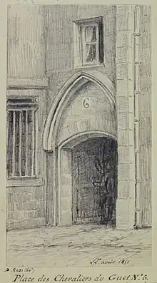 Au XVe siècle, la principale entrée, l'entrée d'honneur, s'ouvrait au milieu de la rue de ce nom, renommée alors rue Perrin-Gasselin et dont il est fait mention dans des titres authentiques des années 1254 et 1269, cités par Jaillot. Cette rue était au XIXe siècle décrite ainsi « obscure et hideuse ruelle qui forme la prolongation jusqu'à la rue Saint-Denis »[3]. Le portail sur la place du Chevalier-du-Guet n'était qu'une porte de dégagement flanquée de tourelles, qui ont disparu dans les premières années du règne de Louis XV, et de deux contreforts carrés. Cette façade extérieure était sévère et offrait peu de traces des éléments caractéristiques de l'architecture civile du XVe siècle[N 2].