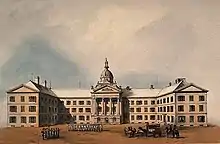 Dès 1826, la Chambre d'assemblée négocie avec l'archevêché pour rénover l'ancien palais épiscopal et en faire l'acquisition. Après négociations, l'offre est acceptée en 1831[29]. Des travaux d'excavation débutent la même année et la chapelle est démolie en 1833 pour faire place au corps principal de l'hôtel du Parlement, qui abrite les deux chambres et les bureaux du gouvernement[30]. Les parlementaires siègent dans cet édifice à colonnades jusqu'à la suspension des pouvoirs de la législature du Bas-Canada en 1838. Le Conseil spécial du Bas-Canada, qui fait office de législature temporaire de 1838 à 1841, tient ses séances à Montréal.