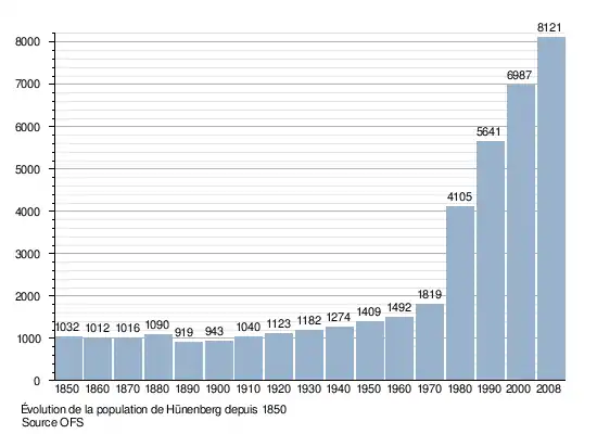 Le graphique suivant résume l'évolution de la population de Hünenberg entre 1850 et 2008[3] :