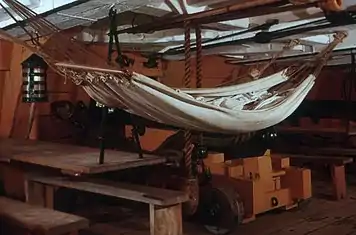 Comme sur la majorité des autres navires de guerre de l'époque, les conditions de logement à bord étaient spartiates. Près de 500 membres de l'équipage étaient logés dans la batterie inférieure (pont le plus bas au-dessus de la ligne de flottaison portant les canons de 32 livres). Comme les écoutilles des canons étaient maintenues fermées, les ponts inférieurs étaient humides, sombres et malodorants[2]. Les marins dormaient dans des hamacs de 40 cm de large, suspendus à des crochets. Les hamacs étaient décrochés quand ils ne servaient pas et étaient rangés dans des filets sur la rambarde du pont supérieur. Ils servaient de protections contre les balles durant les combats et de bouée de sauvetage en cas de chute en mer[6]. 90 tables étaient dressées entre les canons[9] où prenait place un "mess" de 4 à 8 hommes[6].