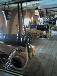 Pour la batterie inférieure de 30 canons de 32 livres[7], chacune de ces pièces pèse 3,5 tonnes (2,75 t pour le canon lui-même et 0,75 t pour son affût en bois). Ils tirent des boulets de 32 livres soit 14,5 kilogrammes. Propulsés par 5 kilogrammes de poudre, ils sortent du canon deux mètres au-dessus de l'eau à une vitesse de 487 mètres par seconde pour atteindre une distance de 1 600 mètres et pénétrer le chêne sur 76 centimètres[6] à bout portant, il était extrêmement rare de voir un boulet traverser une coque, en revanche le choc détachait de longues échardes de bois qui voltigeaient et causaient des sérieuses blessures à l'équipage.