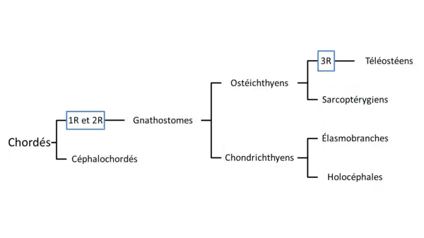 Par contre, les complexes de gènes Hox ont été largement étudiés chez les vertébrés (subdivision des deutérostomes, une division des bilatériens). Les vertébrés possèdent une grande diversité dans l’organisation des complexes de gènes Hox. La variation du nombre de complexes de gènes Hox dans les différents embranchements des vertébrés est la conséquence des différentes duplications du génome au cours de leur évolution. Le groupe basal des céphalochordés, qui n’a pas subi de duplication du génome, ne possède qu’un seul complexe de gènes Hox (en se basant sur le génome de l’amphioxus). Puis, il y a eu deux duplications successives (1R et 2R) chez les gnathostomes menant le nombre de complexes Hox à quatre. Chez les ostéichthyens (sarcoptérygiens et actinoptérygiens), les gènes Hox des sarcoptérygiens sont encore organisés en quatre complexes (A, B, C et D) alors que les actinoptérygiens ont un nombre de complexes Hox très variables. En effet, la majorité des actinoptérygiens font partie des téléostéens, un embranchement ayant subi une troisième duplication génomique (3R) augmentant le nombre de complexes à huit. Toutefois, la majorité des espèces d’actinoptérygiens possèdent uniquement sept complexes dû à la perte du complexe HoxDb, mais d’autres, comme le saumon, possèdent jusqu’à treize complexes Hox dû à un évènement de tétraploïdisation (4R). Chez les chondrichthyens, la composition des complexes de gènes Hox A, B et D est identique alors que le complexe HoxC est entièrement perdu chez les élasmobranches (requins et raies), mais est maintenu chez la chimère (holocéphales)[5].