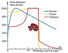 - une balistique plus précise. Lors de l'irradiation d'une zone cancéreuse, le rayonnement traverse les tissus en y déposant une certaine énergie (dose absorbée). Avec des photons ce dépôt en énergie est dégressif au travers du corps traversé alors que dans le cas des ions légers, les particules sont stoppées dans la matière et c'est en fin de parcours où leur dépôt d'énergie est le plus important. Ainsi, en hadronthérapie, et plus particulièrement en carbonethérapie, une grande partie de l'énergie de la particule est déposée sur une courte distance et en profondeur. Cette qualité balistique permet d'atteindre plus précisément des cibles localisées en profondeur et donc de traiter des tumeurs cancéreuses non opérables ou résistantes aux rayons X, tout en épargnant mieux les tissus sains environnants ;