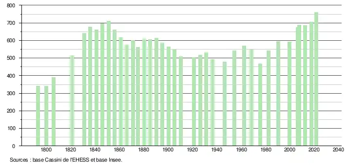 L'évolution du nombre d'habitants est connue à travers les recensements de la population effectués dans la commune depuis 1793. Pour les communes de moins de 10 000 habitants, une enquête de recensement portant sur toute la population est réalisée tous les cinq ans, les populations légales des années intermédiaires étant quant à elles estimées par interpolation ou extrapolation[17]. Pour la commune, le premier recensement exhaustif entrant dans le cadre du nouveau dispositif a été réalisé en 2007[18].