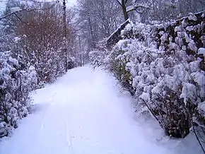 - Faible derrière un « mur végétal » à hauteur limitée et composé de conifères exotiques densément plantés (cyprès, thuyas, troènes…), le vent se heurte à l’obstacle et l’impression de froid peut augmenter à cause des turbulences plus importantes. Ces haies sont par ailleurs bien plus sensibles aux tornades estivales qui les renversent ou aux tempêtes hivernales qui les gèlent.