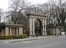 À l'intérieur et autour du parc et des terrains de plaisance classés Grade II se trouvent plusieurs structures historiques classées. Sur Wigan Lane se trouvent une paire de loges carrées en pierre de taille et un arc d'entrée en plein cintre de style classique probablement construites en 1840. Les loges sont de plain-pied avec des toits pyramidaux. L'arc de la passerelle a des portes en fonte ornementales et un support de lampe suspendue suspendu à l'arc. Un autre pavillon en pierre avec un toit en croupe sur Hall Lane à l'ouest du canal date d'environ 1830.