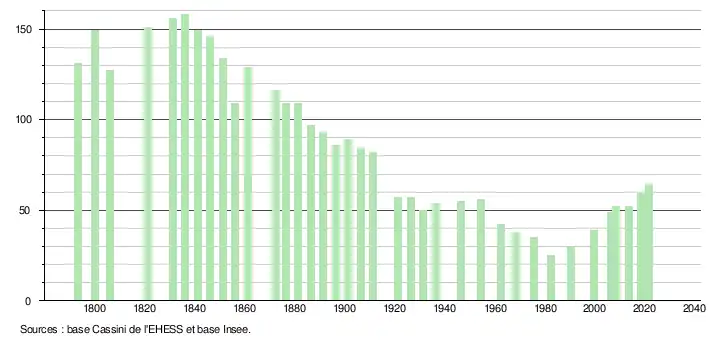 L'évolution du nombre d'habitants est connue à travers les recensements de la population effectués dans la commune depuis 1793. Pour les communes de moins de 10 000 habitants, une enquête de recensement portant sur toute la population est réalisée tous les cinq ans, les populations légales des années intermédiaires étant quant à elles estimées par interpolation ou extrapolation[19]. Pour la commune, le premier recensement exhaustif entrant dans le cadre du nouveau dispositif a été réalisé en 2008[20].