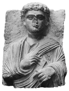Ce buste est appelé Hairan le Bénéficiaire. Une équipe d’archéologue de l'institut russe de Constantinople et de Sofia ont exhumé à Palmyre le buste en 1908 et en 1914 l’ont donné au musée de l’Ermitage à Saint Petersbourg. Un compte rendu en russe (appelé Molivdovulov : kollekcìi Russkago arheologičeskago instituta vʺ Konstantinopolě)[1] a été fait en 1908 pour décrire l’œuvre par M. Pavel Kokovtsov (1861–1942 - spécialiste des études hébraïques et de la sémitologie, fondateur de l'école de sémitologique de Saint-Pétersbourg, connu pour avoir apporté le premier tarif de Palmyre à la Russie. Il ne faut pas oublier qu'à Palmyre même à cette époque, il n'était pas possible d'organiser sa protection ni de la protéger, les autorités turques n'étant pas intéressées à préserver les antiquités de Palmyre).