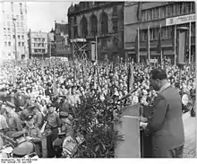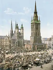De toutes les grandes villes d'Allemagne, Halle ne connut au cours de la Seconde Guerre mondiale que peu de destructions. Des détenus polonais, tchèques, soviétiques, français, néerlandais, etc. du camp de concentration de Birkhahn-Mötzlich[12], une annexe de Buchenwald, furent victimes de travaux forcés dans les usines Siebel Flugzeugwerke, où l'on assemblait des avions de combat. Deux bombardements frappèrent finalement Halle : le premier le , le second dans les premiers jours d'. La gare de triage, qui était visée, resta intacte : les destructions frappèrent la première fois les bâtiments situés entre la gare et le centre-ville puis les quartiers sud. Le , le 7e corps de la 1re Armée américaine prit Halle d'assaut, incendiant au passage la vénérable Roter Turm. On estime que la ville a été relativement épargnée grâce à l'action du comte Felix von Luckner, du maire de la ville et d'un officier de la Wehrmacht qui convinrent de remettre sans combat la ville aux Américains. L'armée américaine évacua la ville en , laissant la place aux forces d'occupation soviétiques.
