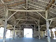 La halle enjambe la rue principale de la commune. Sa datation est difficile, comme pour toutes les halles de ce type construites essentiellement en bois, donc fréquemment sujettes à des dégradations et des réparations fréquentes, voire de reconstructions. Elle est estimée au XVIe siècle. Une date mentionnée, 1768, correspond certainement à un de ces remaniements.