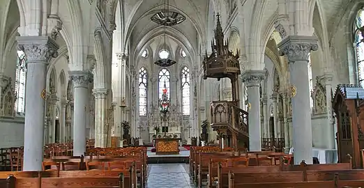 - L'église Notre-Dame-de-Bon-Secours, construite entre 1868 et 1873 en remplacement de l'ancienne église devenue trop vétuste. De style néogothique, elle est l'œuvre de l’architecte Clovis Normand[53] sur une commande de membres de la famille Dambricourt, propriétaire de papeteries à Hallines et à Wizernes. Elle héberge 8 éléments patrimoniaux classés ou inscrits au titre d'objet des monuments historiques[54].
