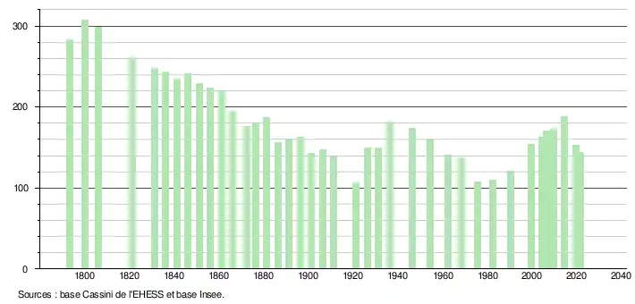 L'évolution du nombre d'habitants est connue à travers les recensements de la population effectués dans la commune depuis 1793. Pour les communes de moins de 10 000 habitants, une enquête de recensement portant sur toute la population est réalisée tous les cinq ans, les populations légales des années intermédiaires étant quant à elles estimées par interpolation ou extrapolation[30]. Pour la commune, le premier recensement exhaustif entrant dans le cadre du nouveau dispositif a été réalisé en 2004[31].
