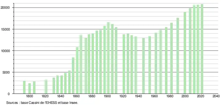 - Par convention dans Wikipédia, le principe a été retenu de n’afficher dans le tableau des recensements et le graphique, pour les populations légales postérieures à 1999, que les populations correspondant à une enquête exhaustive de recensement pour les communes de moins de 10 000 habitants, et que les populations des années 2006, 2011, 2016, etc. pour les communes de plus de 10 000 habitants, ainsi que la dernière population légale publiée par l’Insee pour l'ensemble des communes.