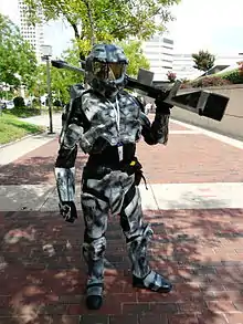 - (en) « … a genetically enhanced super soldier picking up two guns and kicking some alien butt. »