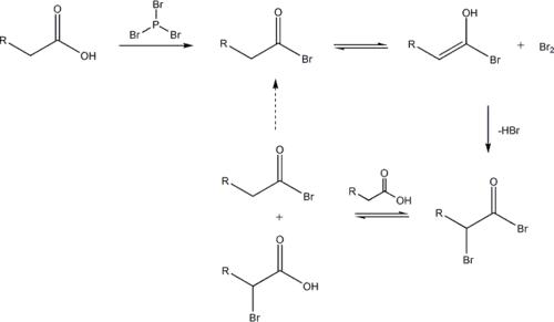 Contrairement à d'autres réactions d'halogénation, cette réaction a lieu en l'absence de support halogène. La réaction commence par addition d'une quantité catalytique de PBr3, après quoi un équivalent molaire de Br2 est ajouté.