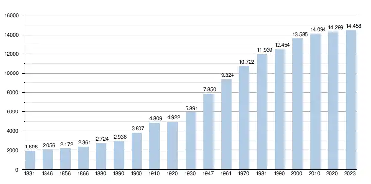 Le graphique suivant décrit l'évolution de la population de la ville. Les données ci-après intègrent les anciennes communes dans les données avant la fusion en 1977.