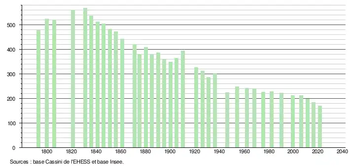 L'évolution du nombre d'habitants est connue à travers les recensements de la population effectués dans la commune depuis 1793. Pour les communes de moins de 10 000 habitants, une enquête de recensement portant sur toute la population est réalisée tous les cinq ans, les populations légales des années intermédiaires étant quant à elles estimées par interpolation ou extrapolation[20]. Pour la commune, le premier recensement exhaustif entrant dans le cadre du nouveau dispositif a été réalisé en 2006[21].