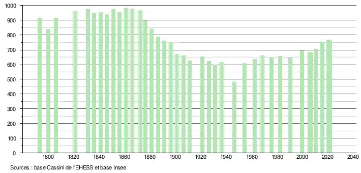 L'évolution du nombre d'habitants est connue à travers les recensements de la population effectués dans la commune depuis 1793. Pour les communes de moins de 10 000 habitants, une enquête de recensement portant sur toute la population est réalisée tous les cinq ans, les populations légales des années intermédiaires étant quant à elles estimées par interpolation ou extrapolation[21]. Pour la commune, le premier recensement exhaustif entrant dans le cadre du nouveau dispositif a été réalisé en 2005[22].