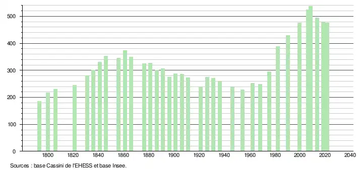 L'évolution du nombre d'habitants est connue à travers les recensements de la population effectués dans la commune depuis 1793. Pour les communes de moins de 10 000 habitants, une enquête de recensement portant sur toute la population est réalisée tous les cinq ans, les populations légales des années intermédiaires étant quant à elles estimées par interpolation ou extrapolation[18]. Pour la commune, le premier recensement exhaustif entrant dans le cadre du nouveau dispositif a été réalisé en 2008[19].