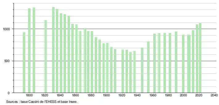 L'évolution du nombre d'habitants est connue à travers les recensements de la population effectués dans la commune depuis 1793. Pour les communes de moins de 10 000 habitants, une enquête de recensement portant sur toute la population est réalisée tous les cinq ans, les populations légales des années intermédiaires étant quant à elles estimées par interpolation ou extrapolation[28]. Pour la commune, le premier recensement exhaustif entrant dans le cadre du nouveau dispositif a été réalisé en 2007[29].