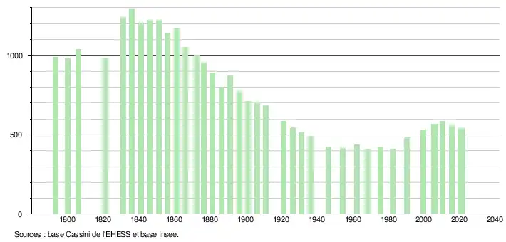 L'évolution du nombre d'habitants est connue à travers les recensements de la population effectués dans la commune depuis 1793. Pour les communes de moins de 10 000 habitants, une enquête de recensement portant sur toute la population est réalisée tous les cinq ans, les populations légales des années intermédiaires étant quant à elles estimées par interpolation ou extrapolation[36]. Pour la commune, le premier recensement exhaustif entrant dans le cadre du nouveau dispositif a été réalisé en 2005[37].