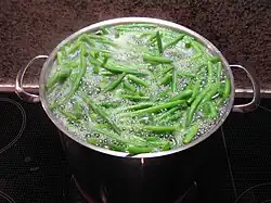 Les haricots verts frais sont cuits à l'eau bouillante très peu salée, les haricots verts en conserve sont égouttés et rincés à l'eau froide, les haricots verts surgelés peuvent être décongelés ou passés directement à l'eau bouillante comme les haricots verts frais.