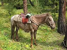Les selles sont des sièges destinés à permettre au cavalier de s'asseoir sur le dos du cheval[7]. Généralement incurvée et le plus souvent en cuir, elle se place sur le dos de la monture, permettant à la fois de répartir le poids porté par celle-ci et de sécuriser le cavalier. Une sangle, parfois légèrement élastique, permet de la maintenir en place en faisant le tour du corps de l'animal et en passant quatre pouces derrière les membres antérieurs. L'étrivière est la pièce, de cuir généralement, reliant la selle à l'étrier.