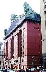 La bibliothèque est une structure massive reposant sur une base en blocs de granite, sur laquelle s'élève un mur de briques, supportant un attique de verre et de métal qui forme, pour les façades donnant sur les rues de State, Congress et Van Buren, des frontons triangulaires. Les murs de brique rouge sont brisés par des baies monumentales se terminant par un arc en plein cintre, hautes de cinq étages, reliées par des guirlandes en bas relief.